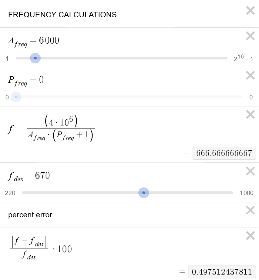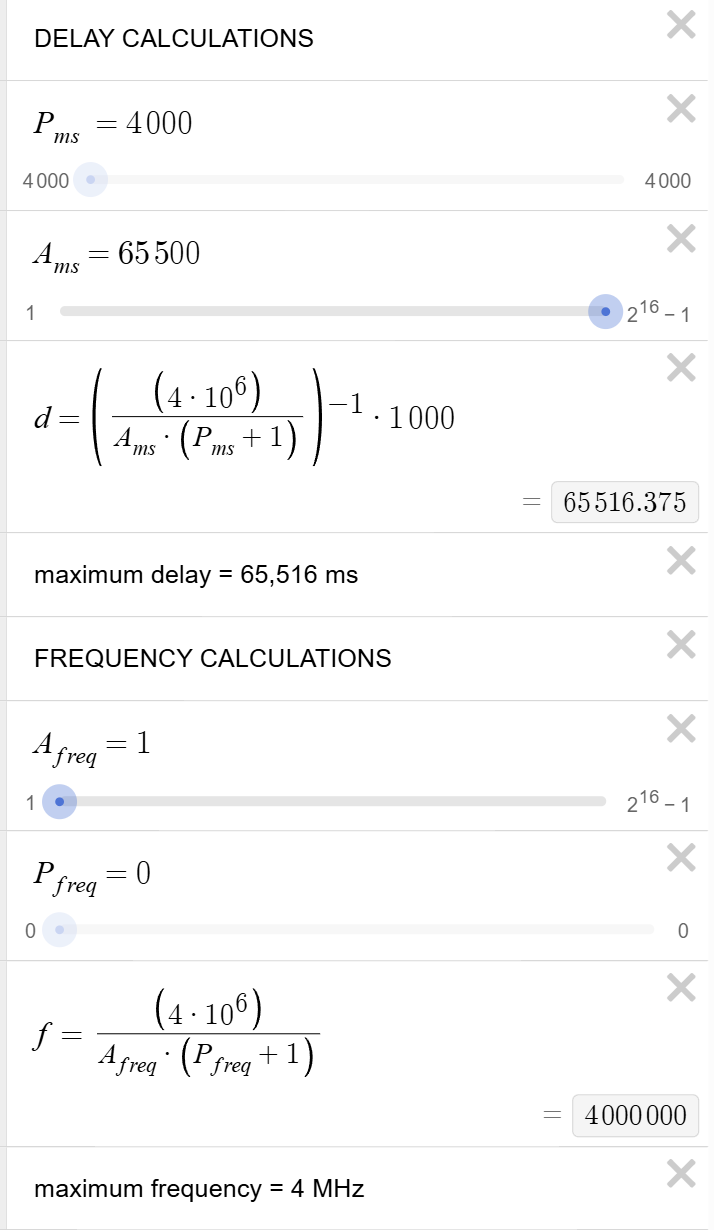 f = 80e6 / ((181+1)*(999+1)) = ~440 HzWould you like help writing a full initialization function or configuring multiple frequencies dynamically?