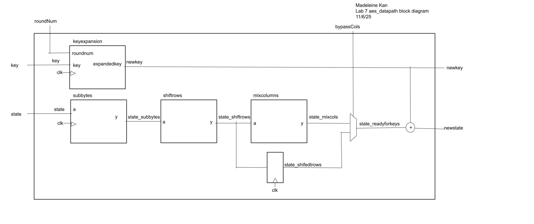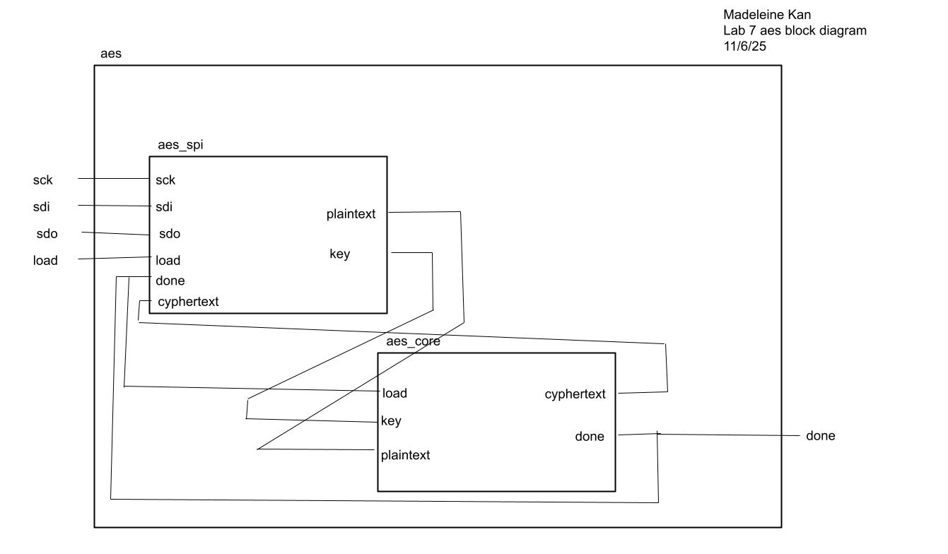 Lab 7 uses the MCU and the FPGA together to perform encryption on a 128-bit long string according to AES-128. There, the FPGA serves an accelerator for the 10 rounds of encryption. Information is communicated between the MCU and the FPGA over SPI.