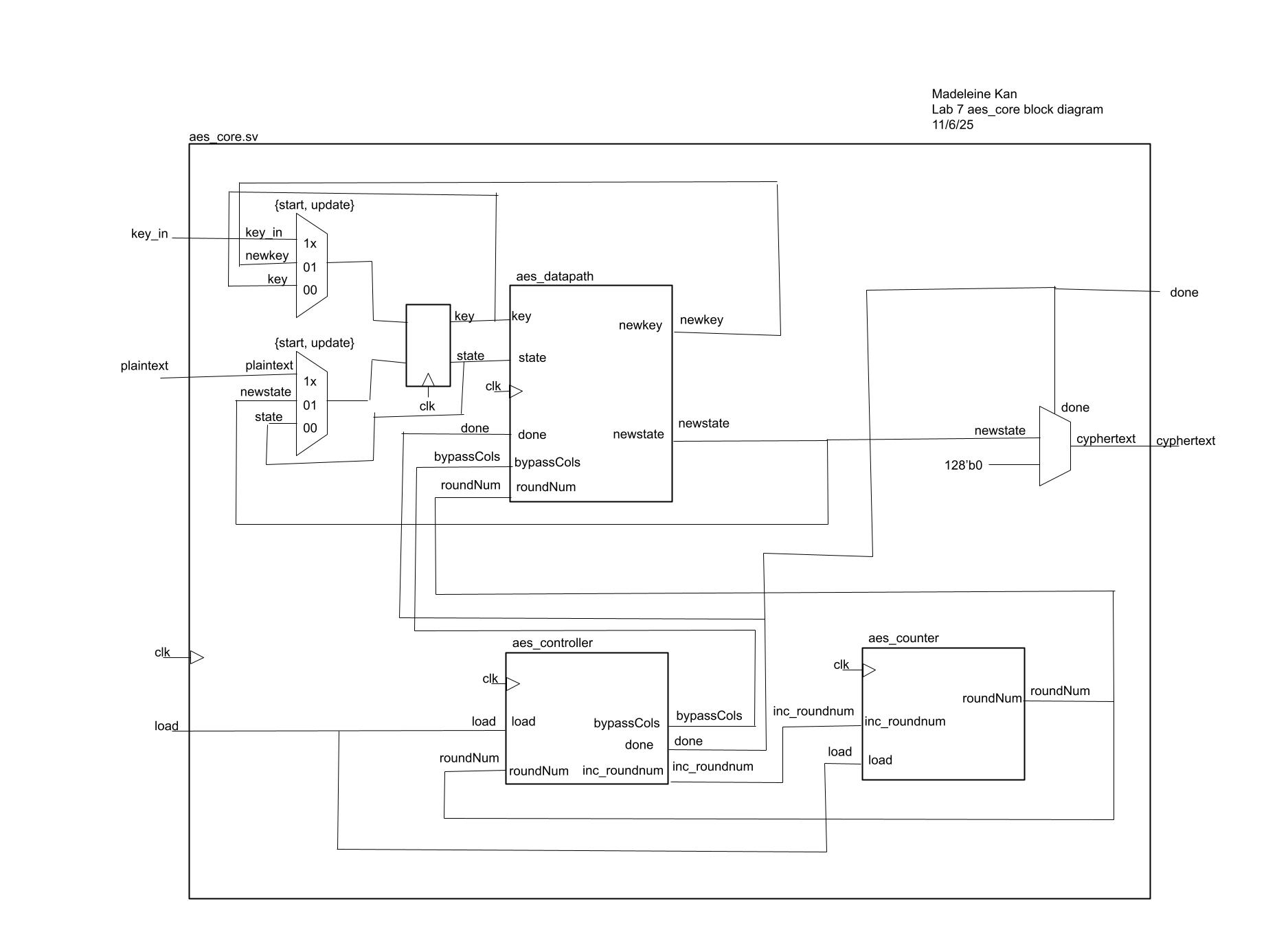 aes core module (performs aes encrpytion using aes datapath, controller FSM, and counter FSM):